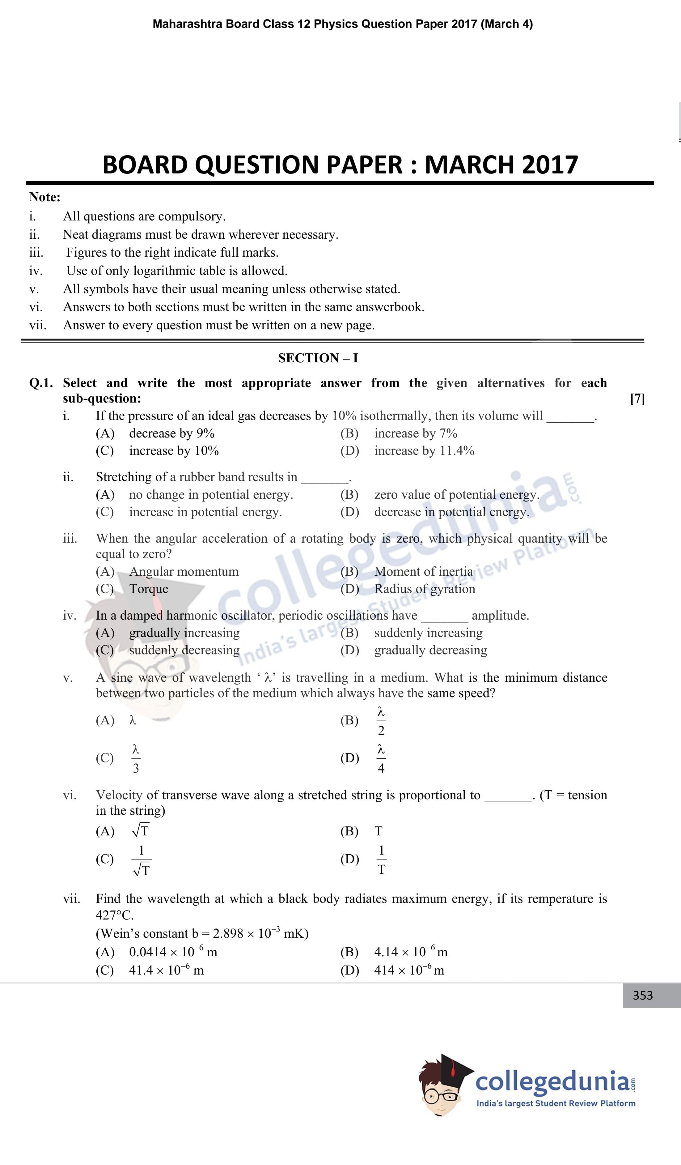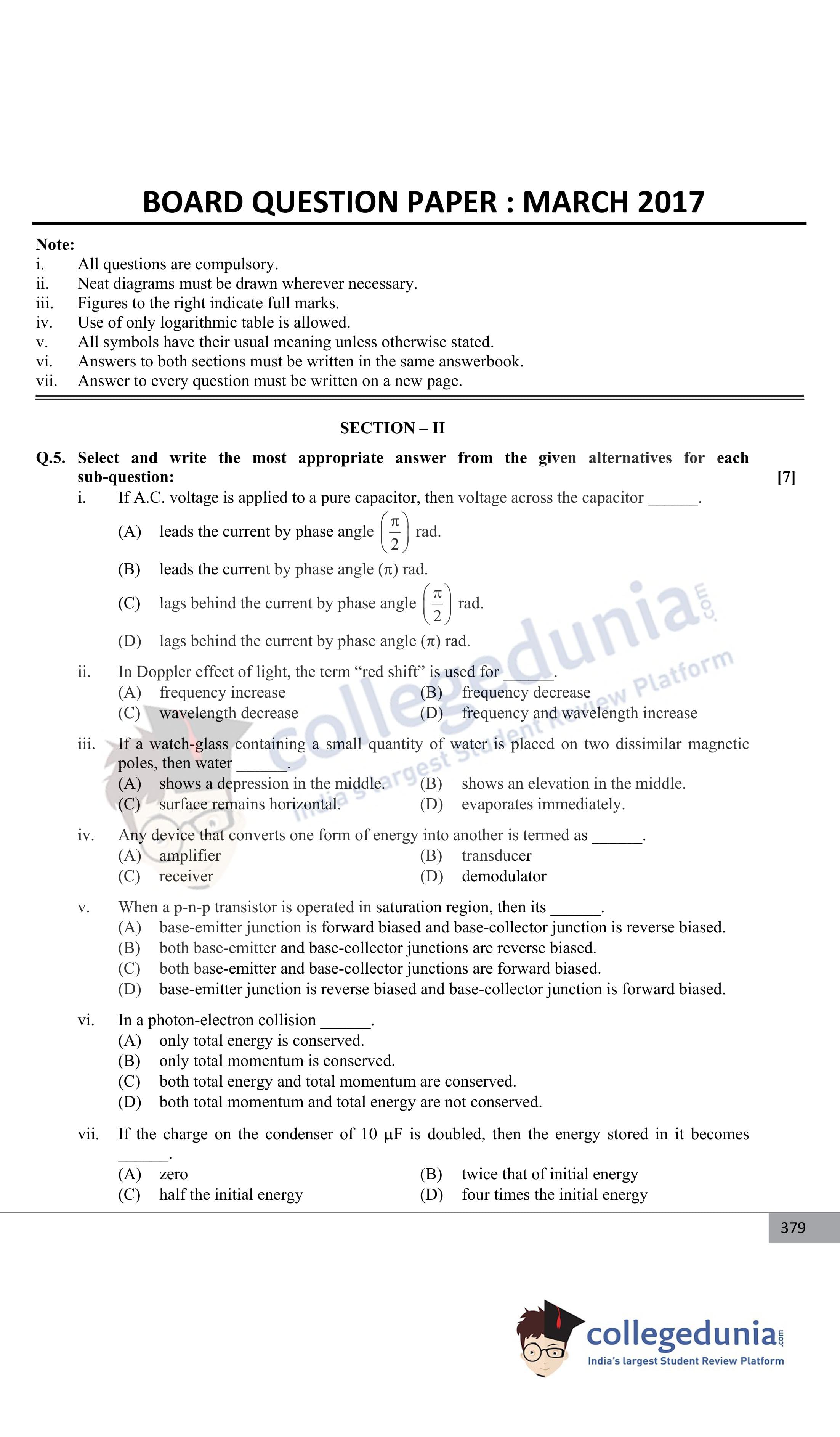 Maharashtra Board Class 12 Physics Question Paper 2017 with Answer Key is available for download. The exam was conducted by the Maharashtra State Board of Secondary & Higher Secondary Education (MSBSHSE) on March 4, 2017 in the Morning Session 11.00 AM to 2.00 PM. The medium of paper was English. The question paper comprised a total of 8 questions divided among 2 sections.