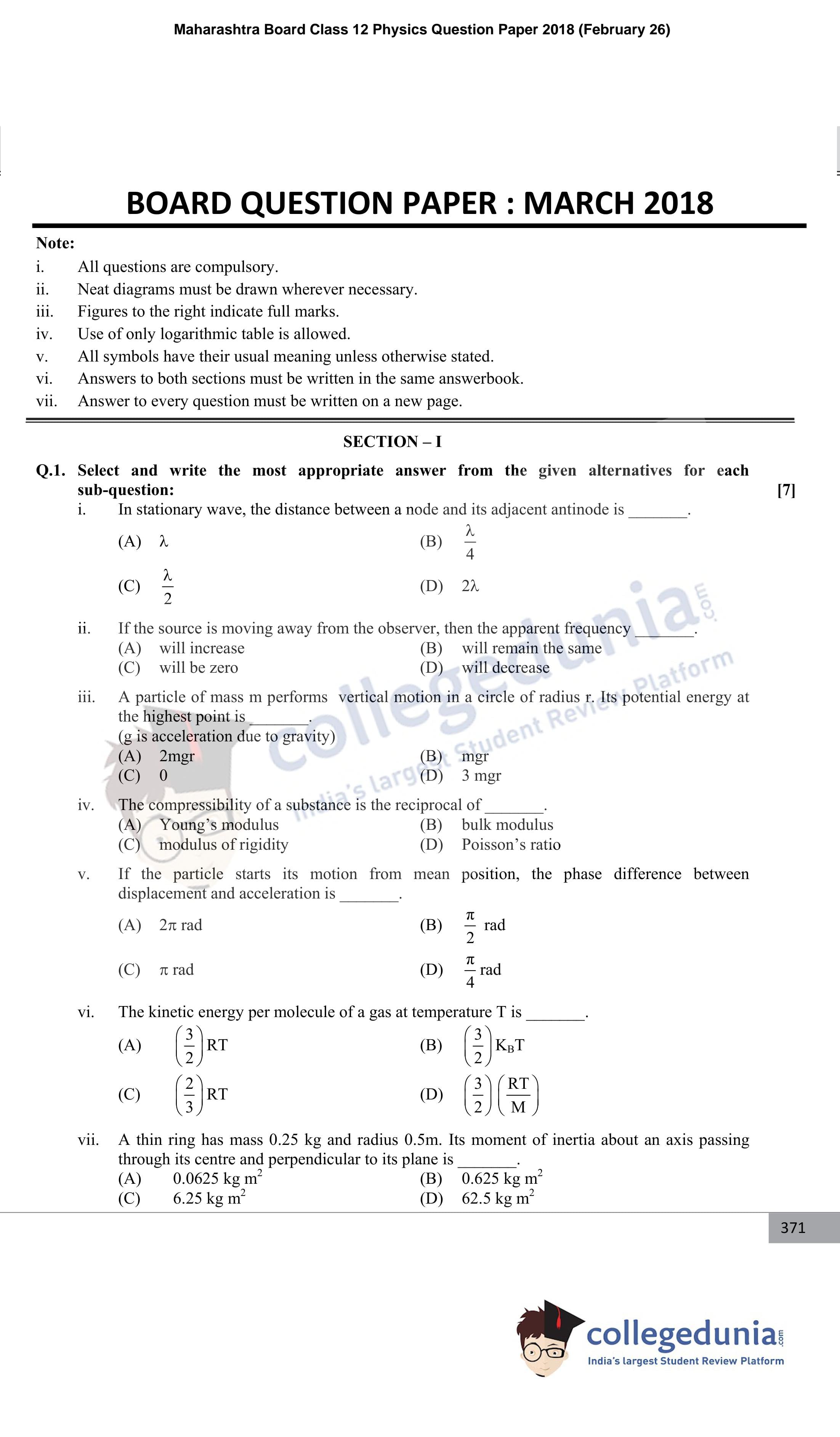 | Maharashtra Board Class 12 Physics Question Paper 2018 PDF | Maharashtra Board Class 12 Physics Answer Key 2018 PDF |