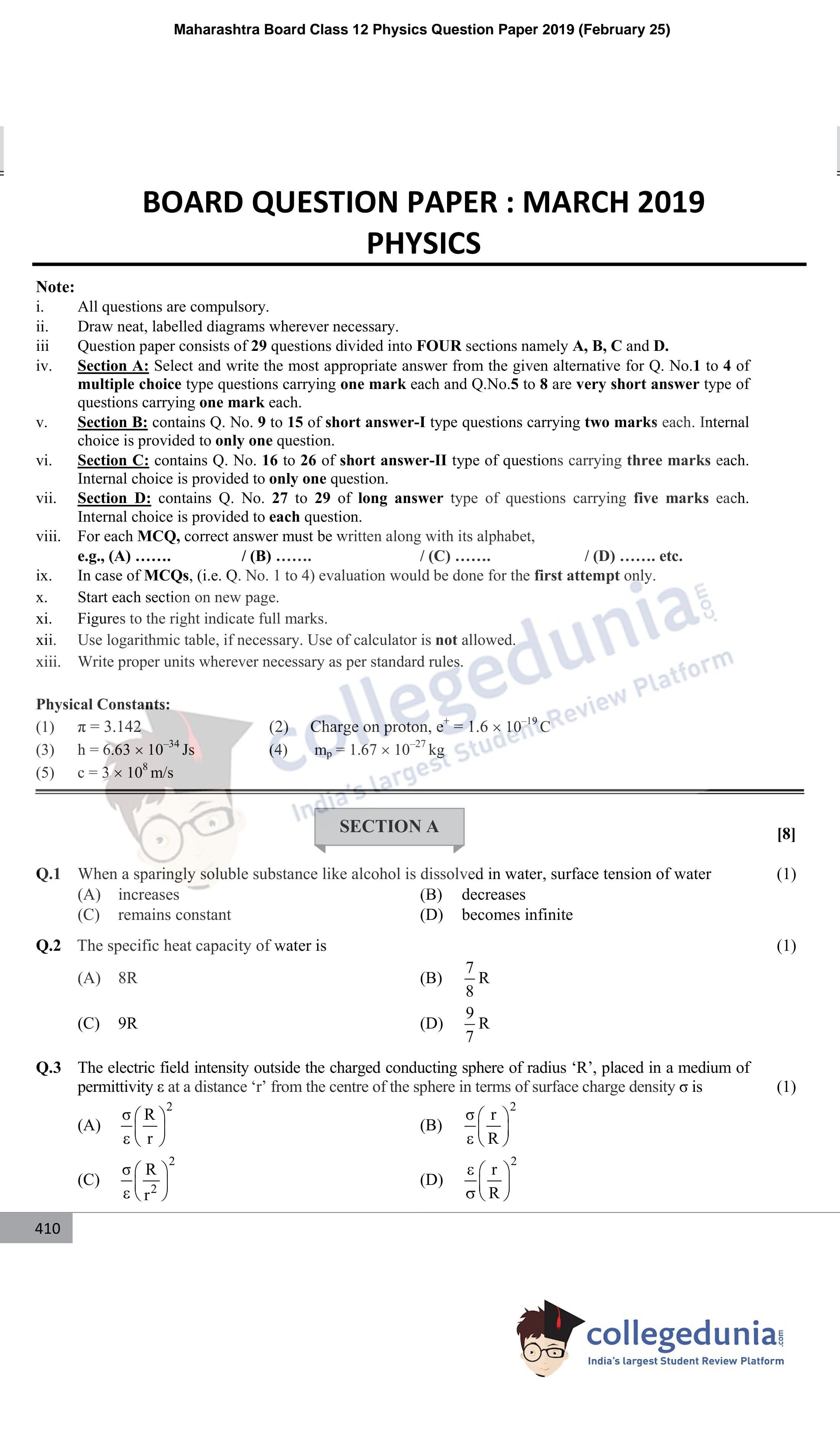 Maharashtra Board Class 12 Physics Question Paper 2019 with Answer Key is available for download. The exam was conducted by the Maharashtra State Board of Secondary & Higher Secondary Education (MSBSHSE) on February 25, 2019 in the Morning Session 11.00 AM to 2.00 PM. The medium of paper was English. In terms of difficulty level, Maharashtra Board Class 12 Physics paper was of Moderate level. The question paper comprised a total of 29 questions divided among 4 sections.