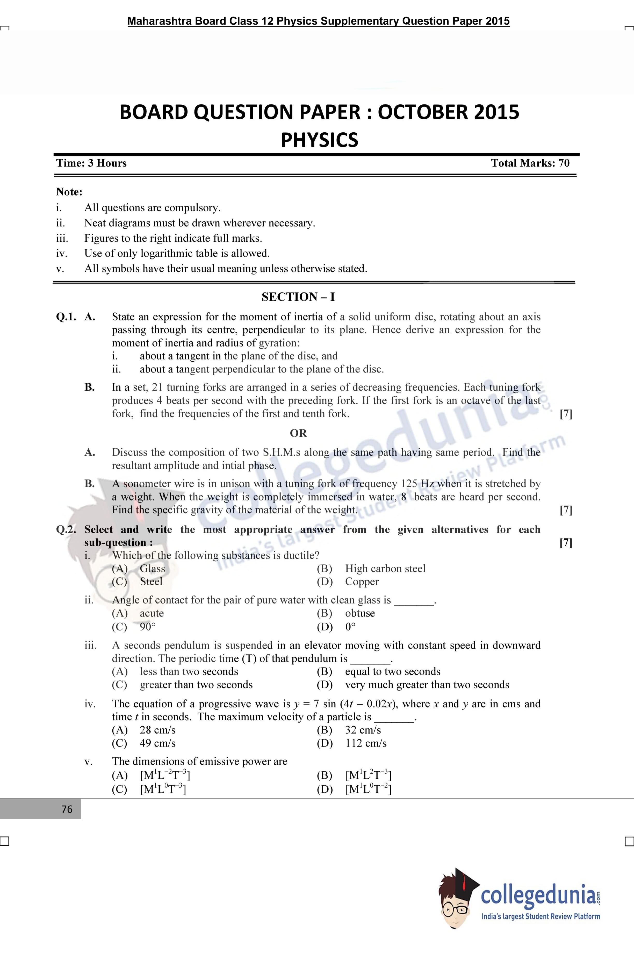 Maharashtra Board Class 12 Physics Supplementary Question Paper 2015 with Answer Key