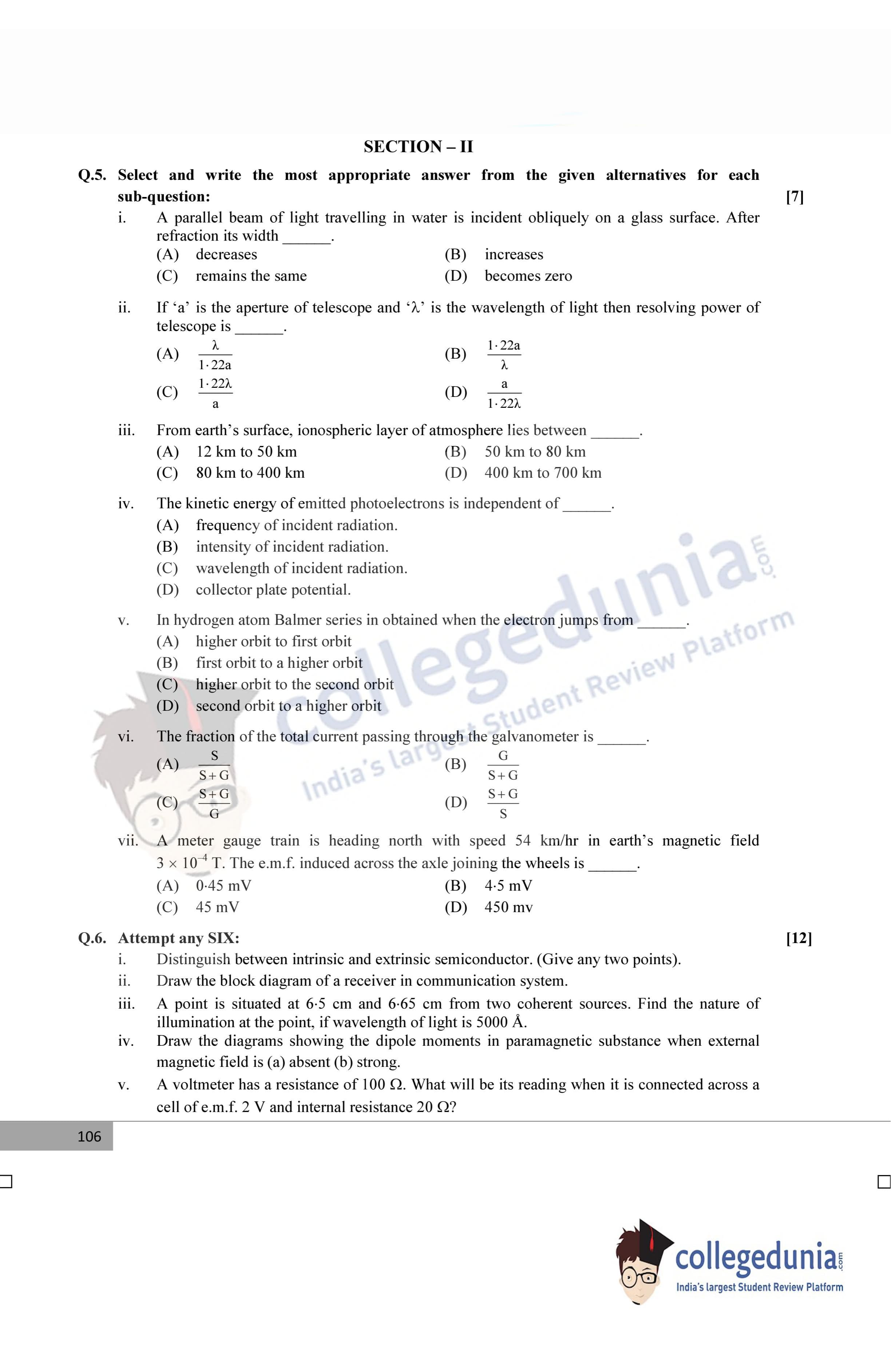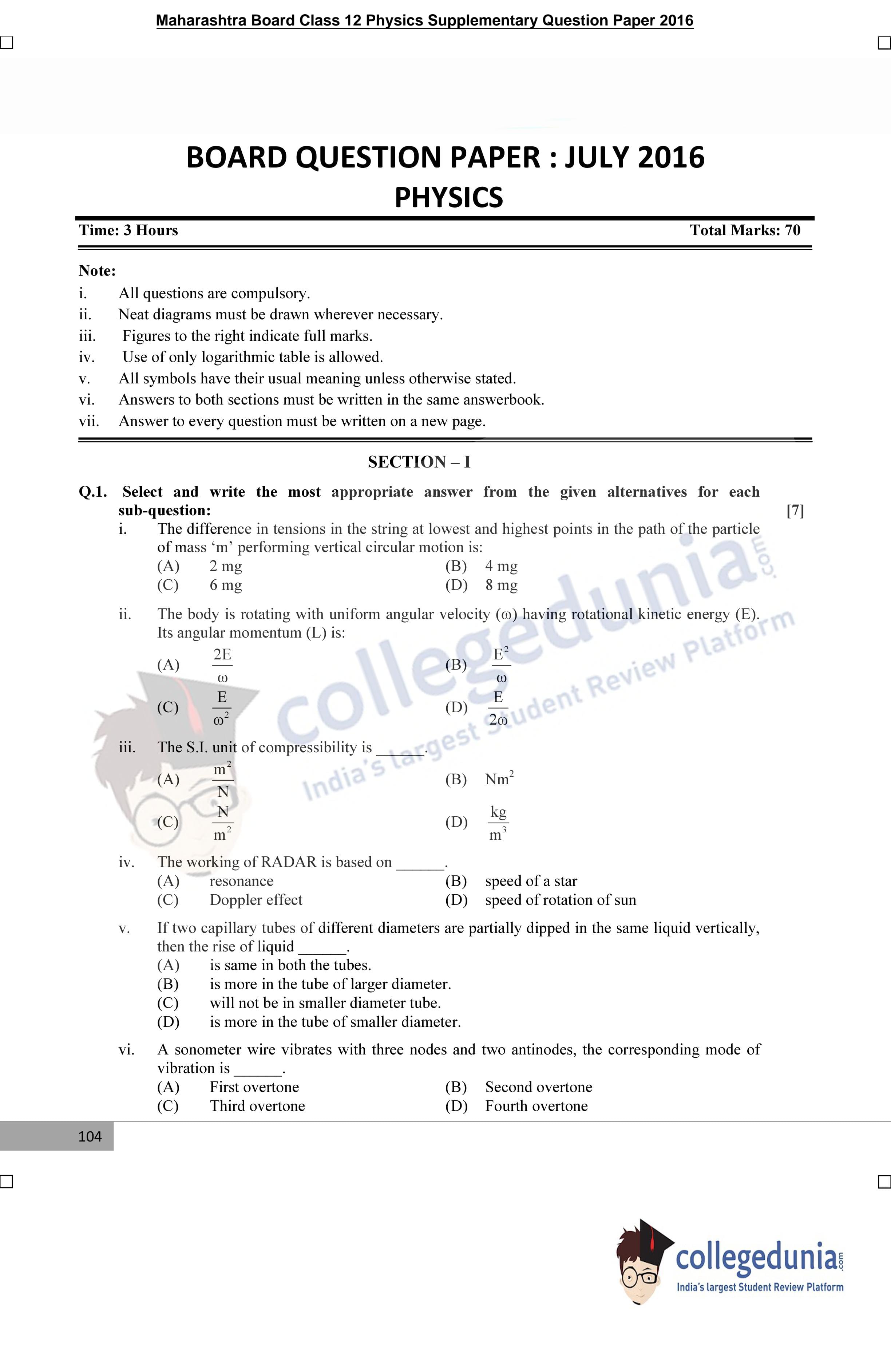 Maharashtra Board Class 12 Physics Supplementary Question Paper 2016 with Answer Key is available for download. The exam was conducted by the Maharashtra State Board of Secondary & Higher Secondary Education (MSBSHSE). The medium of paper was English. The question paper comprised a total of 8 questions divided among 2 sections.