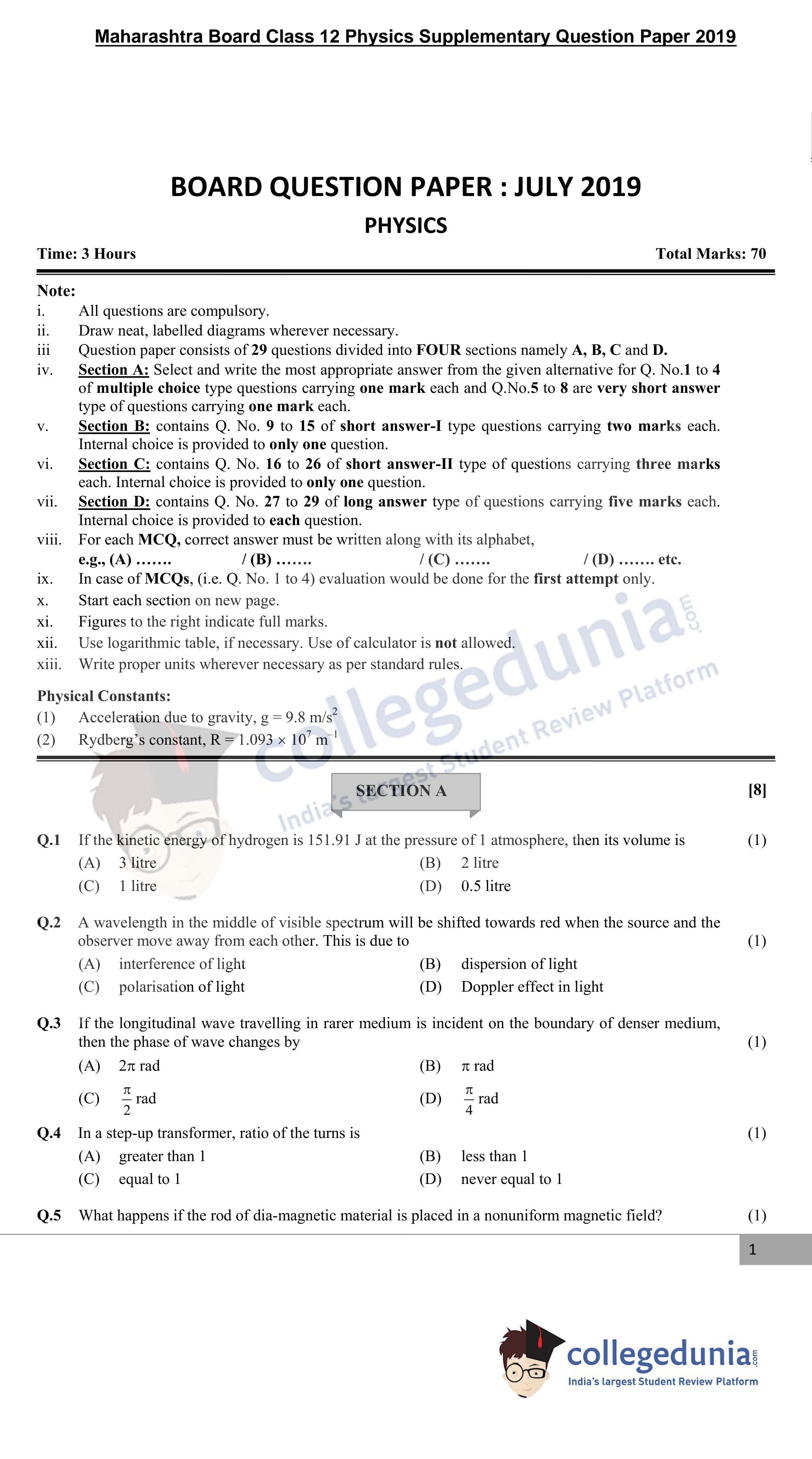 Maharashtra Board Class 12 Physics Supplementary Question Paper 2019 with Answer Key is available for download. The exam was conducted by the Maharashtra State Board of Secondary & Higher Secondary Education (MSBSHSE) . The medium of paper was English. The question paper comprised a total of 29 questions divided among 4 sections.