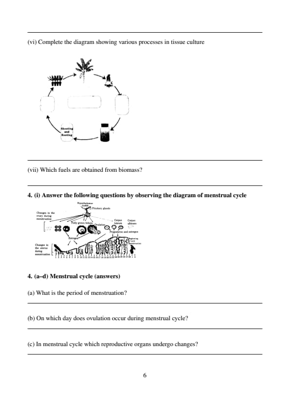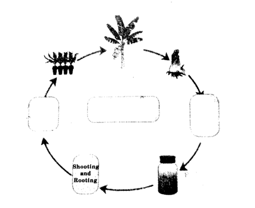 6. Planting and maturation: Transplant hardened plantlets to the field or nursery where they grow into mature plants, completing the cycle. Quick Tip: Key stages to fill diagram blanks: Explant selection, Surface sterilization, Inoculation on medium, and Hardening/acclimatization before field planting.