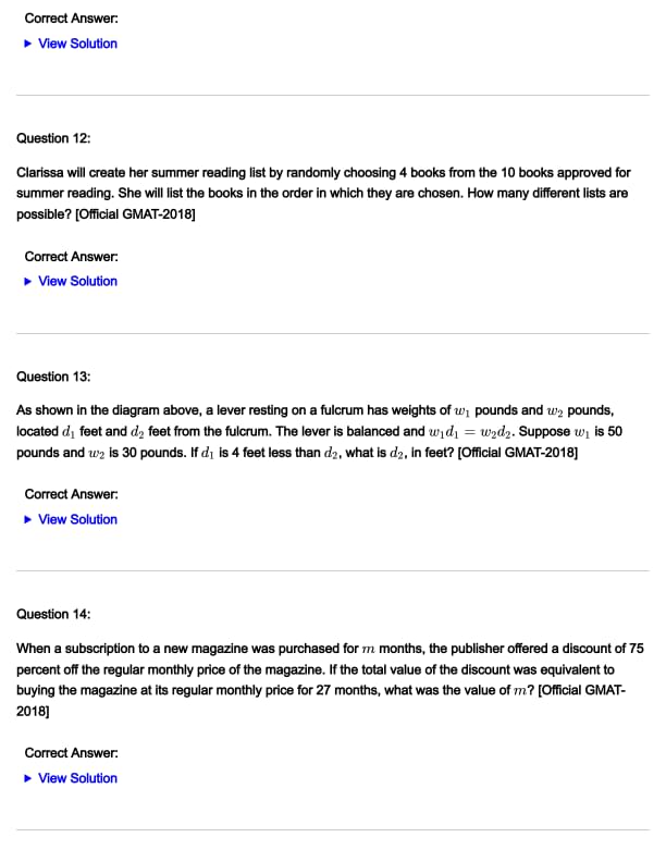 As shown in the diagram above, a lever resting on a fulcrum has weights of \( w_1 \) pounds and \( w_2 \) pounds, located \( d_1 \) feet and \( d_2 \) feet from the fulcrum. The lever is balanced and \( w_1d_1 = w_2d_2 \). Suppose \( w_1 \) is 50 pounds and \( w_2 \) is 30 pounds. If \( d_1 \) is 4 feet less than \( d_2 \), what is \( d_2 \), in feet? [Official GMAT-2018]
