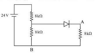 The circuit shown consists of resistors and a diode. To find the potential difference between points A and B, we first analyze the circuit behavior. Since the diode is forward biased (due to the potential difference from the 24V battery), it will conduct. The resistors \( R_1 \) and \( R_2 \) are in series, with a total resistance of: \[ R_{total} = R_1 + R_2 = 8\,k\Omega + 8\,k\Omega = 16\,k\Omega \]