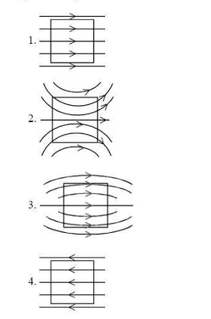 A uniform magnetic field, parallel to the plane of the paper existed in space initially directed from left to right. When a bar of soft iron is placed in the field parallel to it, the lines of force passing through it will be represented by: