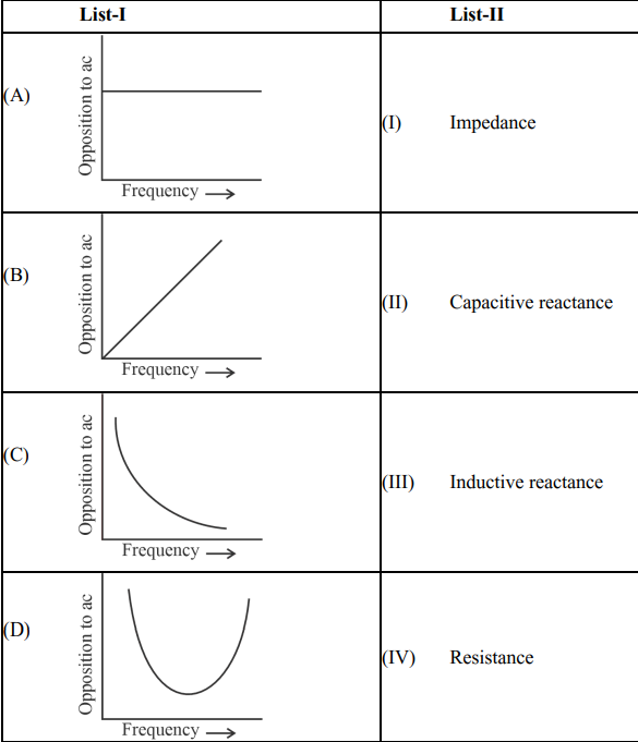 Match List-I with List-II showing variation of opposition to flow of AC versus frequency characteristics in the circuit: