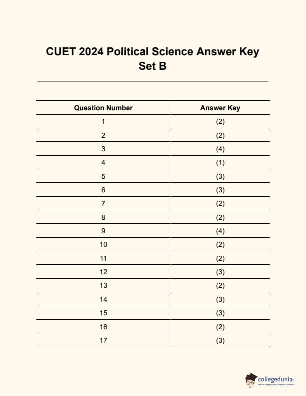 The NTA conducted the CUET 2024 Political Science exam on May 18 in Shift 1A. Unofficial CUET 2024 Political Science Answer Key provided by subject matter experts are available for download. Official answer key 2024 will be released by the NTA after the exam process @cuet.nta.nic.in Candidates can use the CUET Political Science answer key 2024 to calculate their scores by comparing their responses with the correct answers.