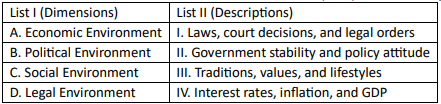 Match the Dimensions of Business Environment (List I) with their respective descriptions (List II):
