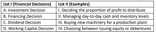 Match the types of financial decisions in List I with their real-life examples in List II: