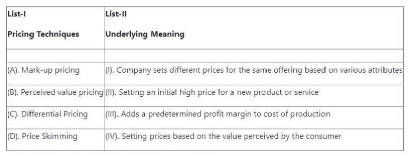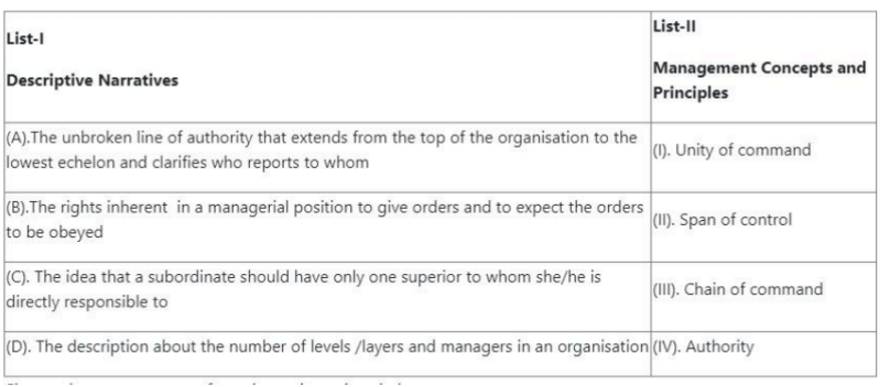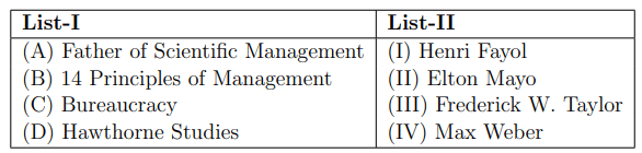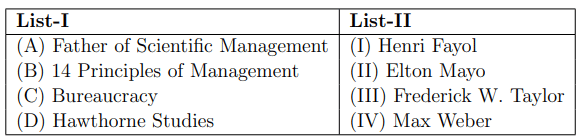 (A) → (III), (B) → (I), (C) → (IV), (D) → (II) Quick Tip: Matching management concepts with theorists helps understand the origin of management principles.