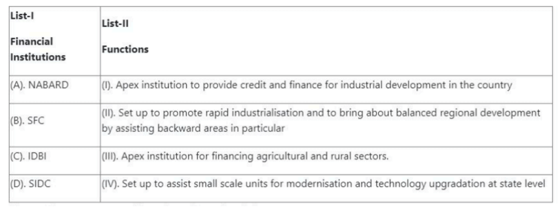 Quick Tip: Remember: NABARD → Agriculture, SFC → Backward areas, IDBI → Industry, SIDC → Small scale units.