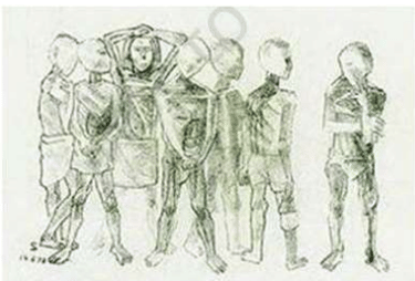 The question requires identifying the artist of the artwork. The style—stark, linear, and filled with pathos—is characteristic of a specific modern Indian artist renowned for his prints and sculptures on human suffering.