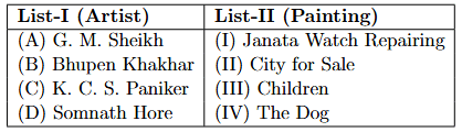 Quick Tip: In matching questions, start with the pairs you are most certain about. Here, Bhupen Khakhar's "Janata Watch Repairing" and G. M. Sheikh's "City for Sale" are very famous pairings. Finding these two correct matches (A-II, B-I) is enough to identify the correct option from the given choices.