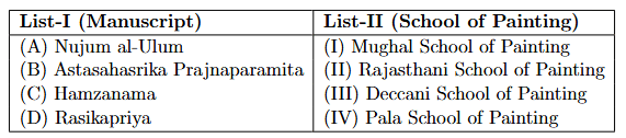 Quick Tip: Creating mental flashcards linking key manuscripts to their schools (e.g., Hamzanama -> Mughal, Prajnaparamita -> Pala, Nujum al-Ulum -> Deccani) is a very effective way to prepare for such matching questions in art history.