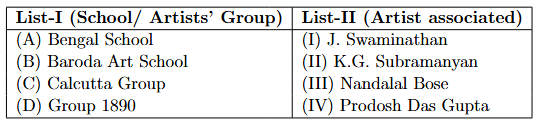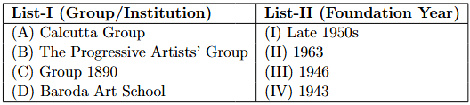 Quick Tip: For dates in art history, remember the key chronological sequence: Calcutta Group (early 40s)\(\rightarrow\)Progressive Artists' Group (late 40s)\(\rightarrow\)Baroda School (early 50s)\(\rightarrow\)Group 1890 (early 60s). This relative order can help you solve matching questions even if the exact years in the options are slightly off.