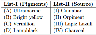 Quick Tip: Some pigment-source connections are fundamental in art history. Remember these key pairs: Ultramarine = Lapis Lazuli (Blue), Vermilion = Cinnabar (Red), and Orpiment = Yellow. Knowing just these three is often enough to solve such matching questions.