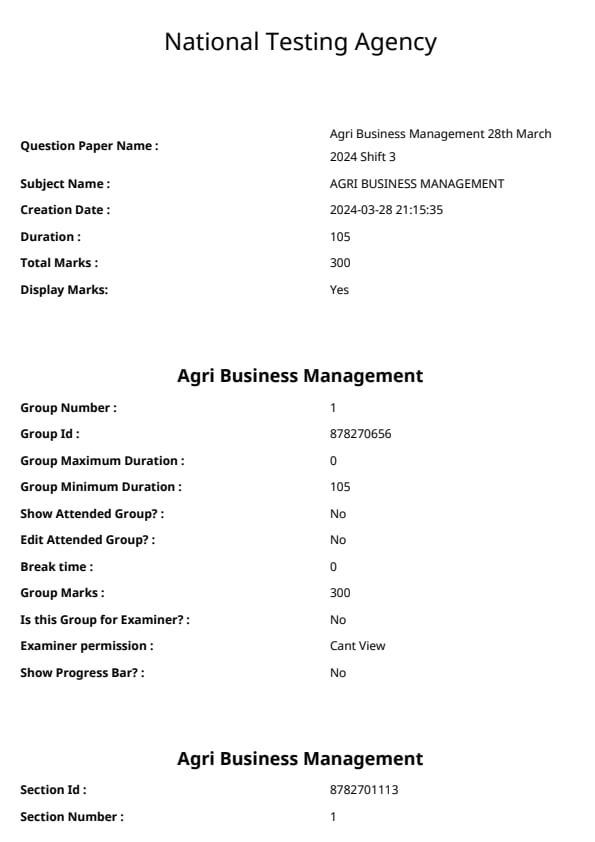 CUET PG Agri-Business Management Question Paper 2024 will be available here for download. NTA conducted CUET PG Agri-Business Management paper 2024 on from March 28 in Shift 3. CUET PG Question Paper 2024 is based on objective-type questions (MCQs). According to latest exam pattern, candidates get 105 minutes to solve 75 MCQs in CUET PG 2024 Agri-Business Management question paper.
