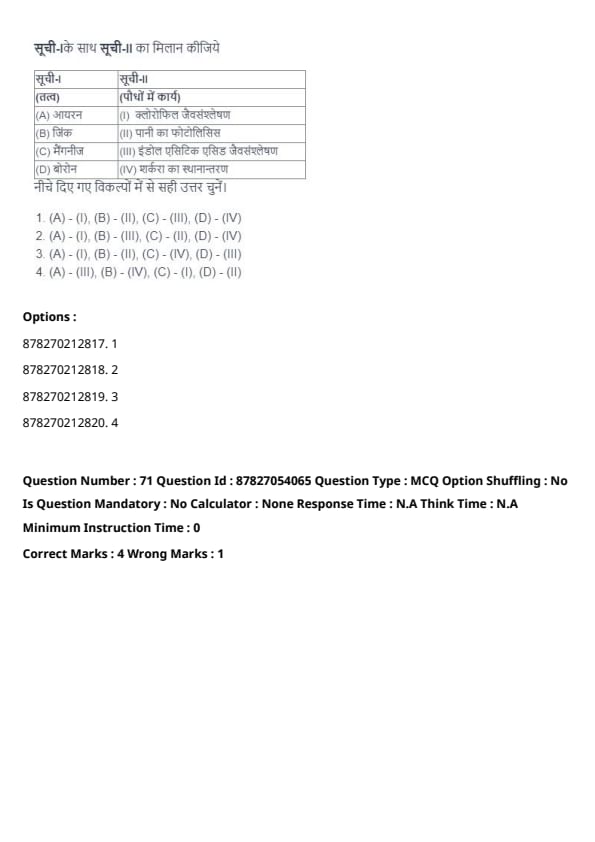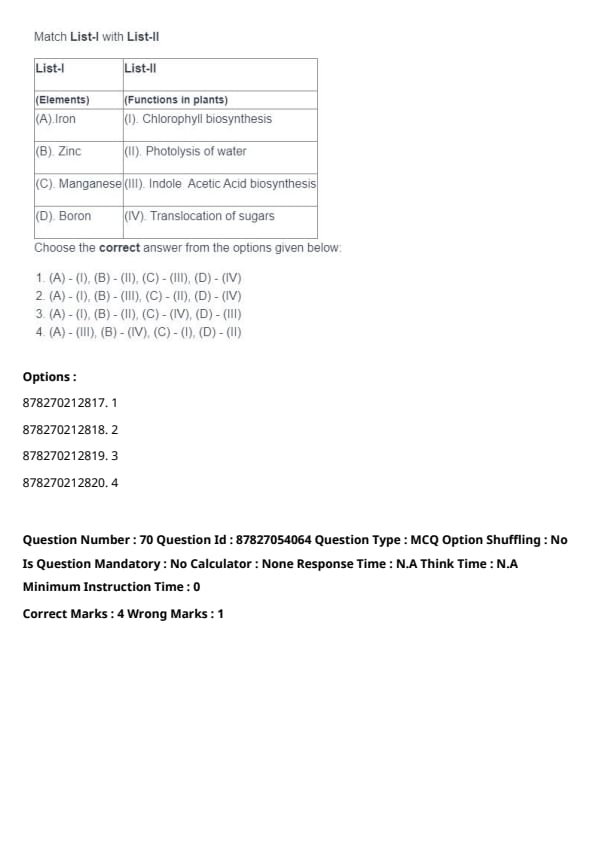 | (A) Iron | (I) Chlorophyll biosynthesis |
