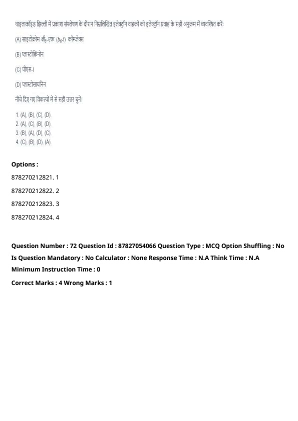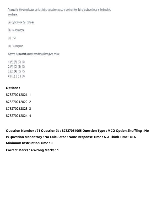 Arrange the following electron carriers in the correct sequence of electron flow during photosynthesis in the thylakoid membrane: