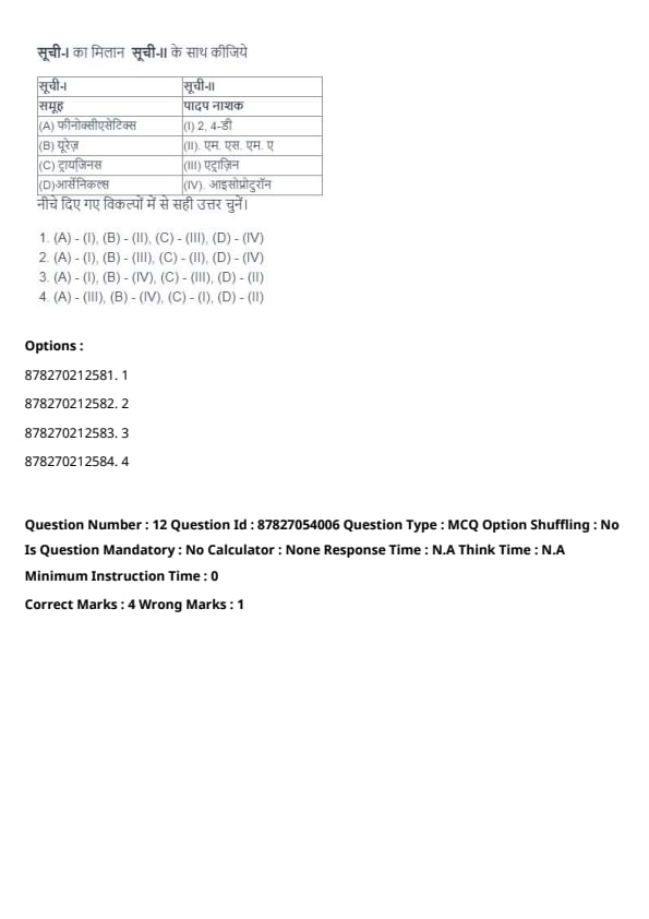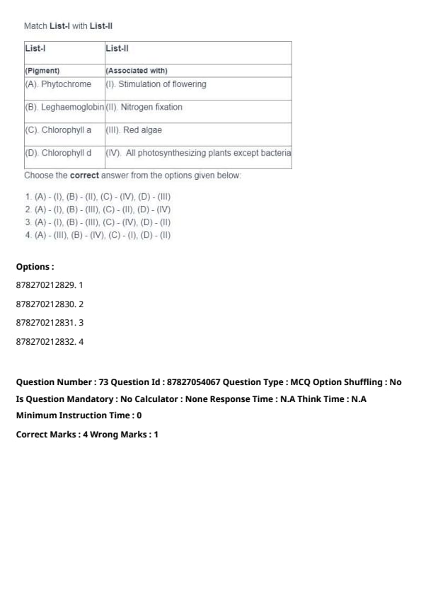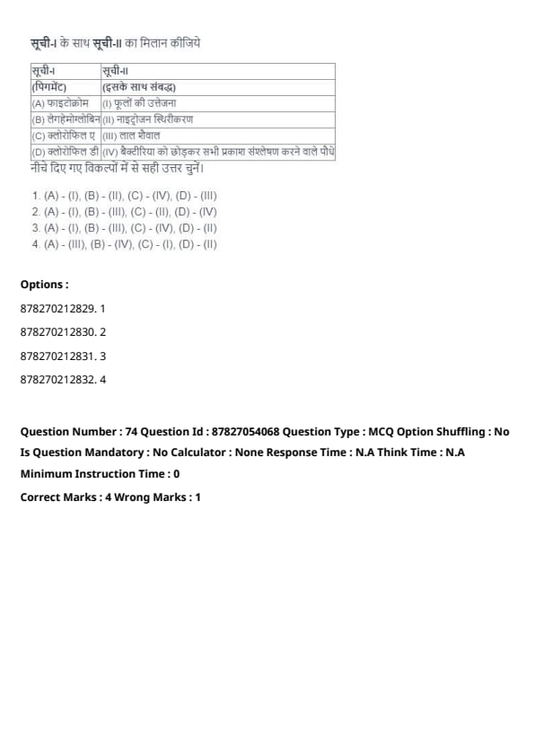 | (C) Chlorophyll a | (IV) All photosynthesizing plants except bacteria |