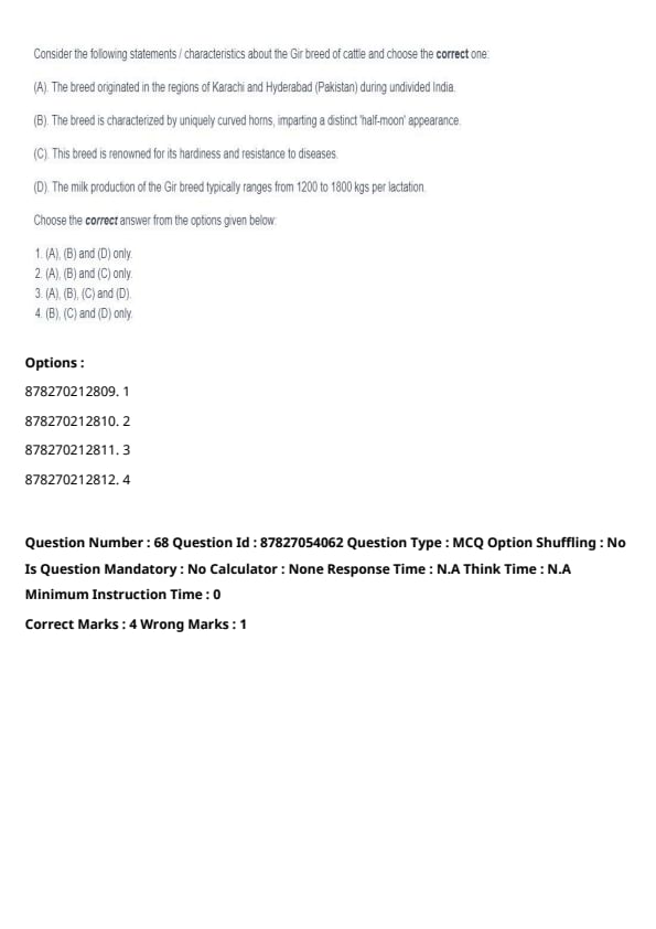 The Gir breed is known for its curved horns ("half-moon" shape). It is disease-resistant and hardy, making it a preferred breed for dairy farming. Milk production ranges between 1200-1800 kgs per lactation. Statement (A) is incorrect as the breed originated in Gujarat, India, not Karachi or Hyderabad.