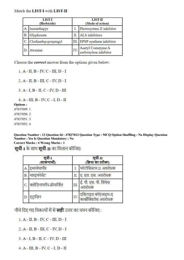 LIST-I (Herbicide) \hfill LIST-II (Mode of action)