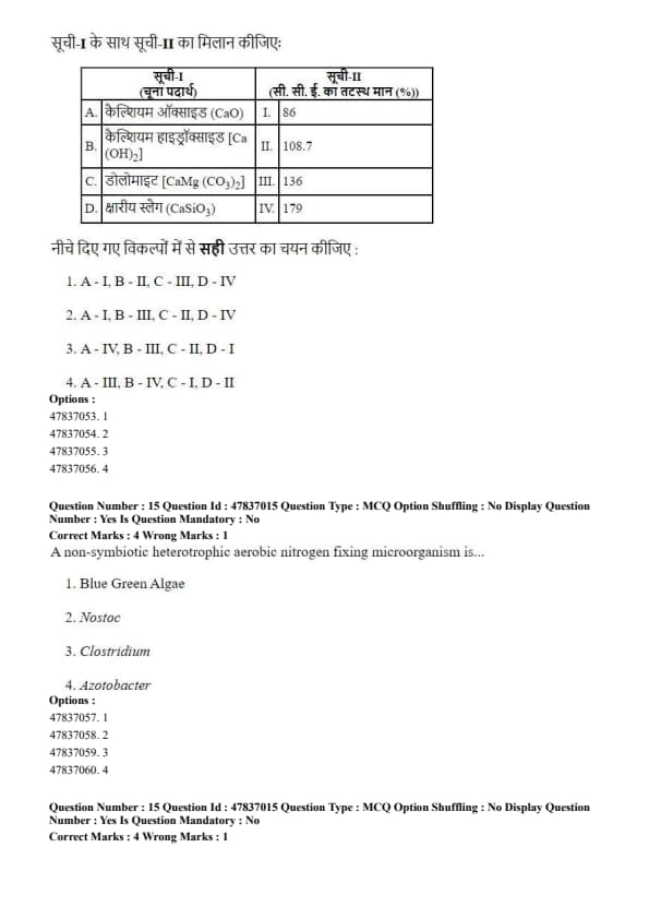 Step 3: Blue green algae and Nostoc are photosynthetic organisms, while Clostridium is an anaerobic nitrogen fixer. Hence, Azotobacter is the correct answer. Quick Tip: Azotobacter is an important free-living aerobic nitrogen fixer commonly found in neutral to alkaline soils.