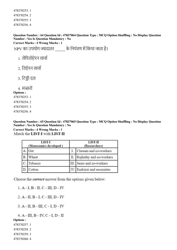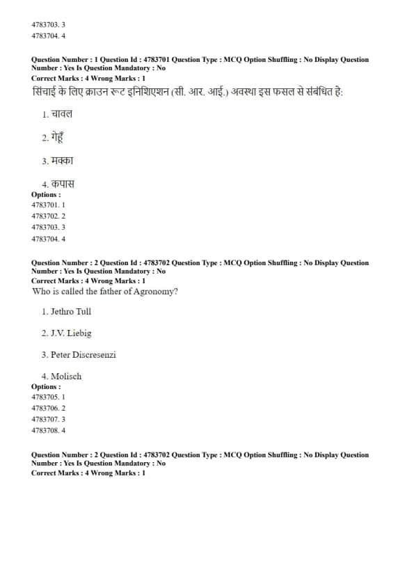 Step 3: Other crops like rice, maize, and cotton do not have a specifically defined CRI stage for irrigation scheduling. Quick Tip: In wheat cultivation, irrigation at the CRI stage is crucial because it determines proper root development and directly affects the number of tillers and final grain yield.