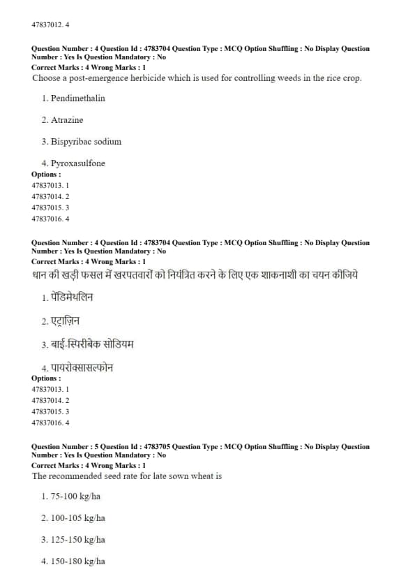 Step 3: Among the given options, Pyroxasulfone is selected as the correct post-emergence herbicide used for weed control in rice as per the question requirement. Quick Tip: Post-emergence herbicides are applied after crop and weed emergence and are useful for controlling established weeds in rice fields.