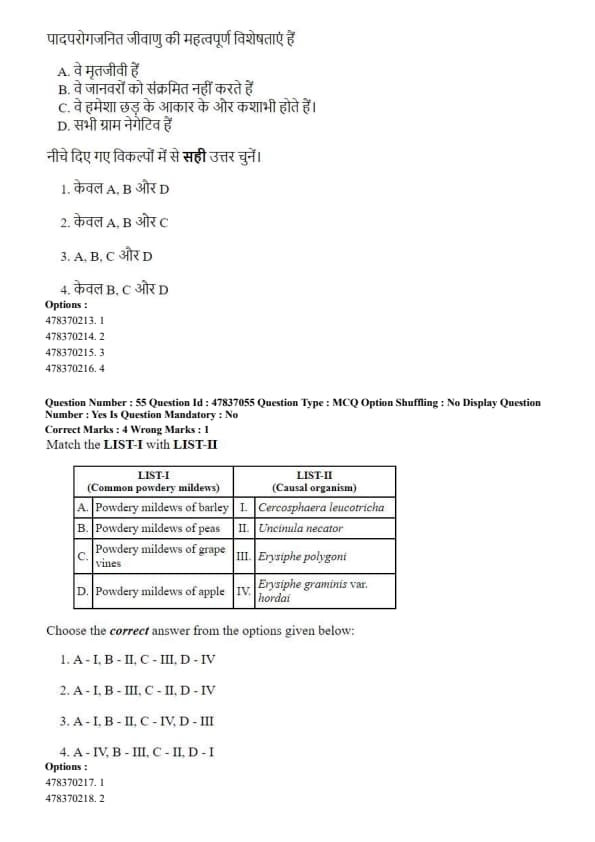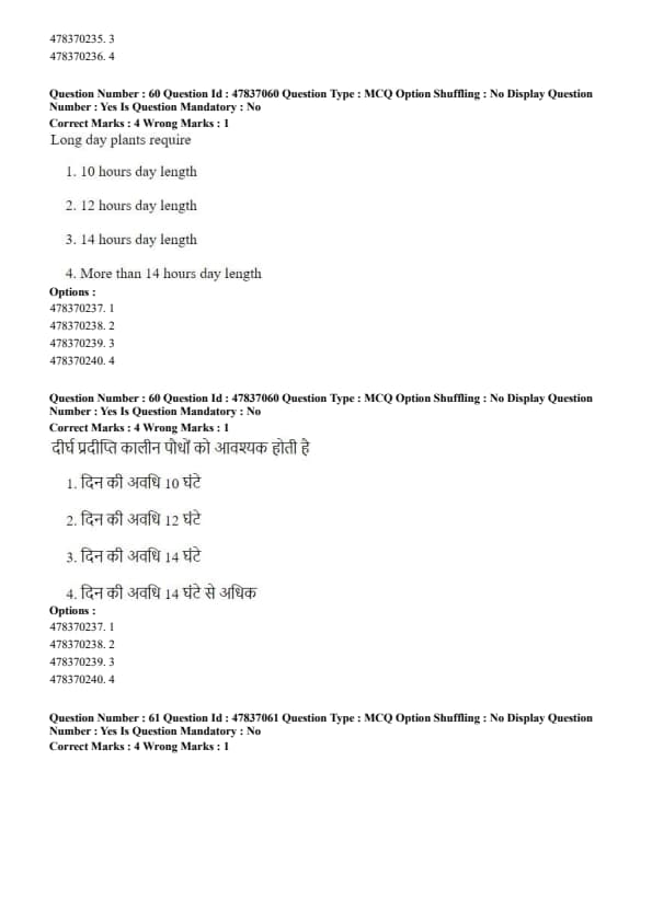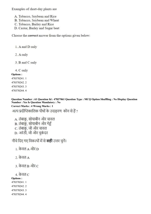 Step 3: Wheat, barley, and sugar beet are long-day plants, while castor is generally considered day-neutral. Hence, only option A is correct. Quick Tip: Short-day plants flower when the night length exceeds a critical duration.