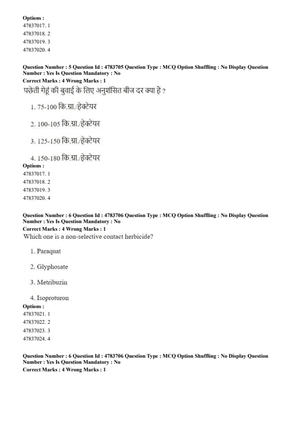 Step 3: Glyphosate is non-selective but systemic, whereas metribuzin and isoproturon are selective herbicides. Quick Tip: Paraquat is a fast-acting, non-selective contact herbicide, commonly used for quick burn-down of weeds.