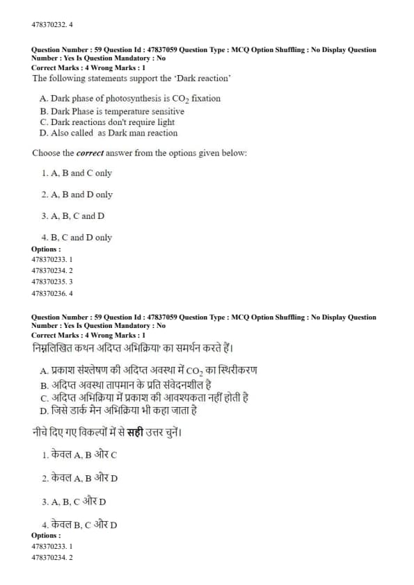 Step 4: The term “Dark man reaction” is incorrect; hence statement D is not valid. Quick Tip: Dark reaction is also known as the Calvin cycle and occurs in the stroma of chloroplasts.