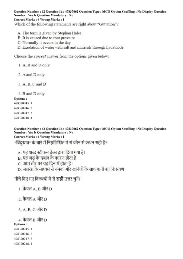 Step 4: The term guttation was not given by Stephen Hales, making statement A incorrect. Hence, statements B and D are correct. Quick Tip: Guttation is commonly observed in grasses and small herbaceous plants during humid nights.