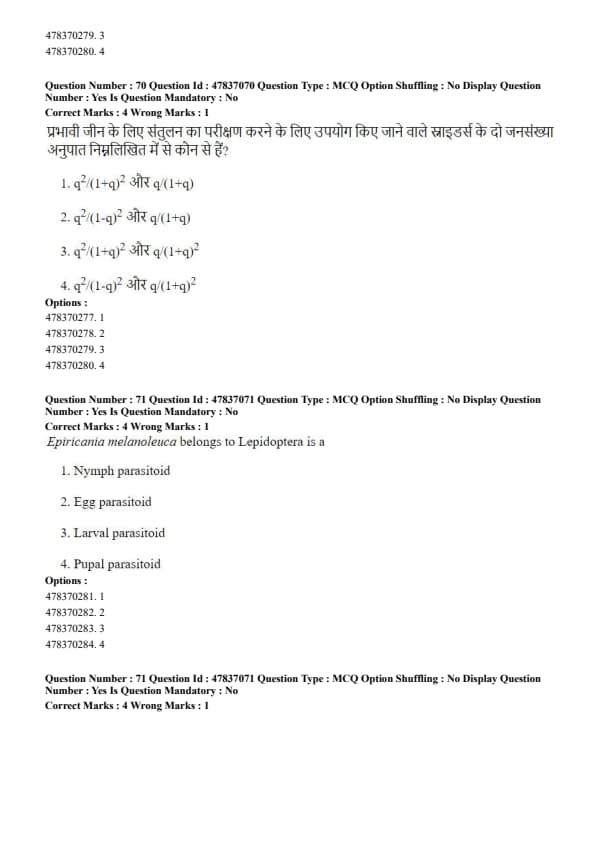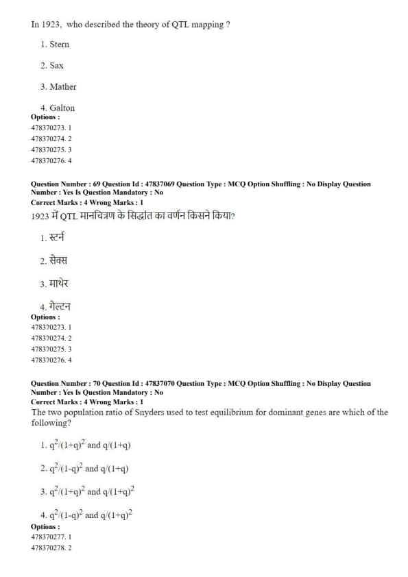 Step 3: These ratios are \(\dfrac{q^2}{(1+q)^2}\) and \(\dfrac{q}{(1+q)}\), which are compared to test equilibrium conditions. Quick Tip: Snyder’s test is specifically applied for dominant traits where genotype frequencies cannot be directly distinguished phenotypically.