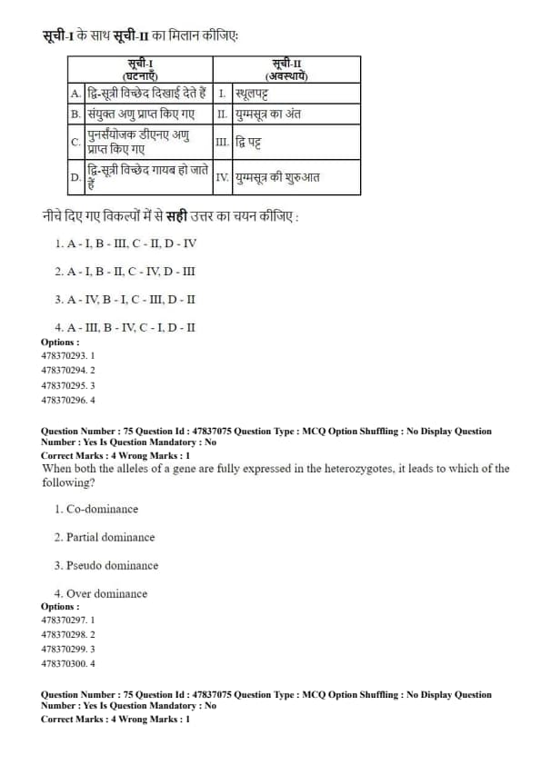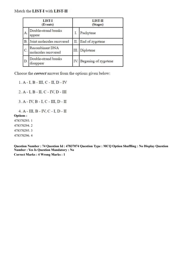Step 4: Hence, the correct matching corresponds to option (B). Quick Tip: Pachytene is the most critical stage of meiosis for genetic recombination and crossing over.