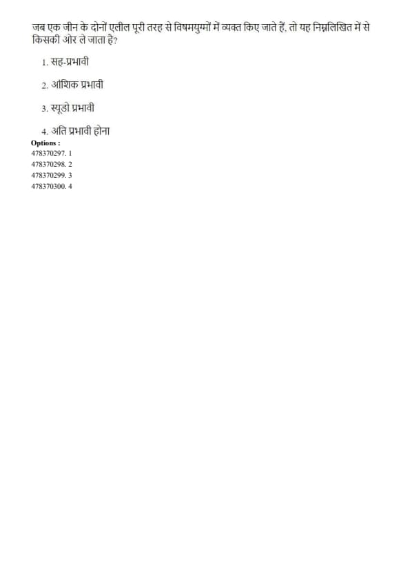 Step 3: A classic example of co-dominance is the AB blood group in humans, where both A and B antigens are expressed. Quick Tip: Co-dominance differs from incomplete dominance, where the heterozygote shows an intermediate phenotype.