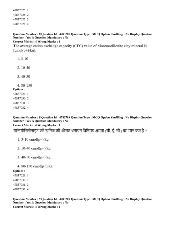 Step 3: Due to its large surface area and high charge density, montmorillonite exhibits a very high CEC ranging from 80 to 150 cmol(p⁻)/kg. Quick Tip: Among clay minerals, montmorillonite has one of the highest CEC values due to its 2:1 expanding lattice structure.