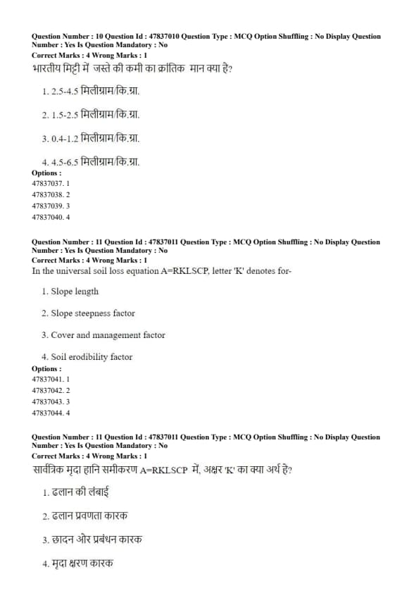 Step 3: The factor `K` represents the soil erodibility factor, which indicates the susceptibility of soil to erosion based on its texture, structure, permeability, and organic matter content. Quick Tip: Soils with high silt content and low organic matter generally have higher erodibility (K value).