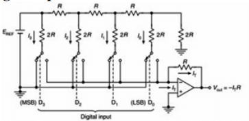 The given diagram is of a 4-bit switched current-source Digital to Analog Converter (DAC), where \( E_{REF} = 10V \) and \( R = 5 \, k\Omega \). What will be the output voltage \( V_{out} \) for the digital input 1101?