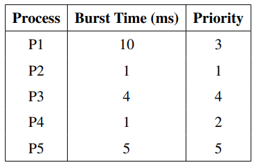 Consider the following set of processes, assumed to have arrived at time 0 in the order P1, P2, P3, P4, and P5, with the given length of the CPU burst (in milliseconds) and their priority: