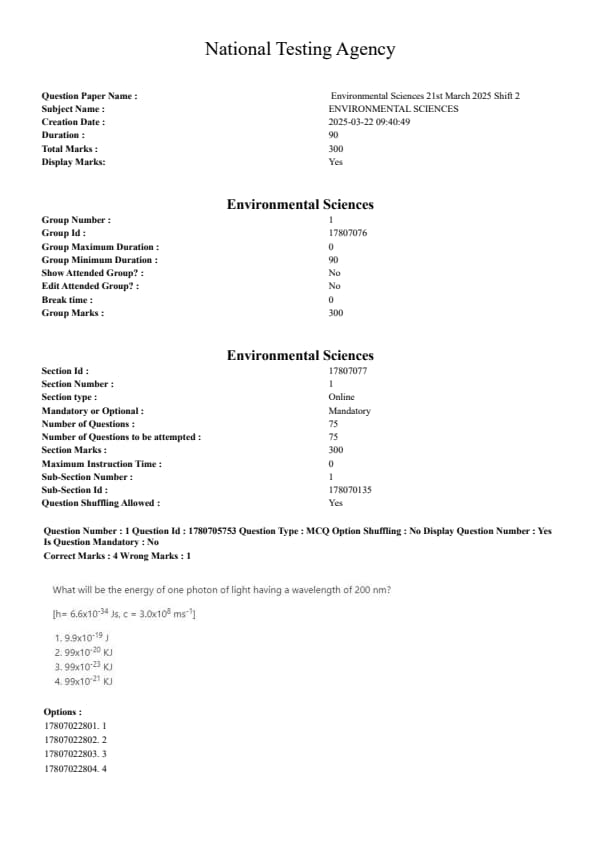 Step 3: Substitute the given values: \[ E = \frac{(6.6 \times 10^{-34})(3.0 \times 10^{8})}{200 \times 10^{-9}} \]