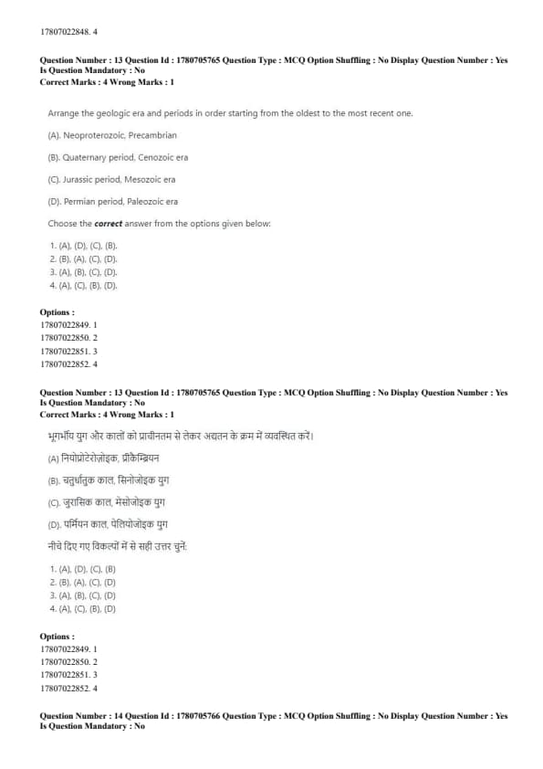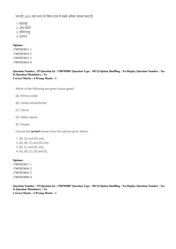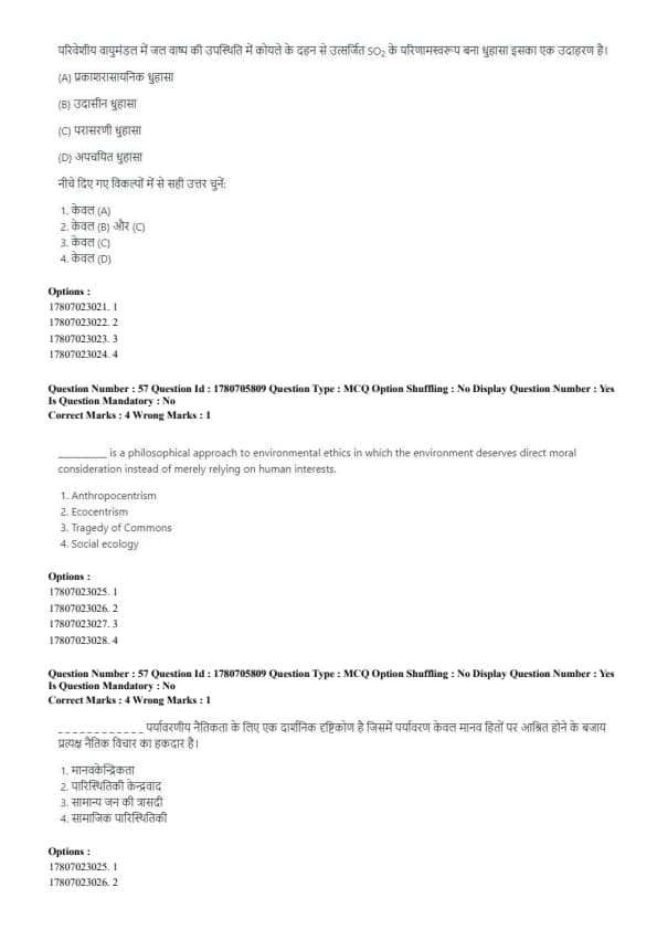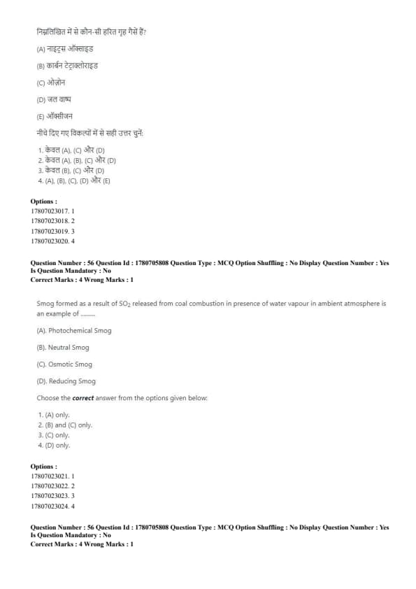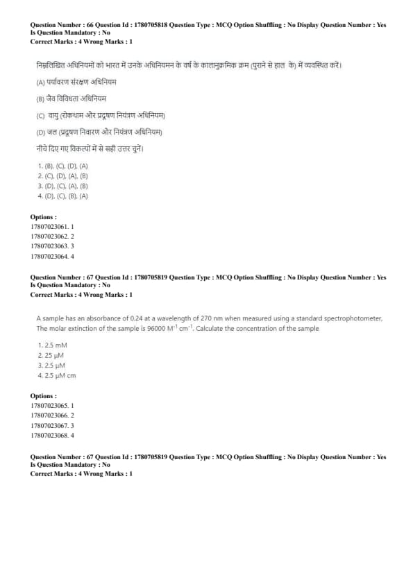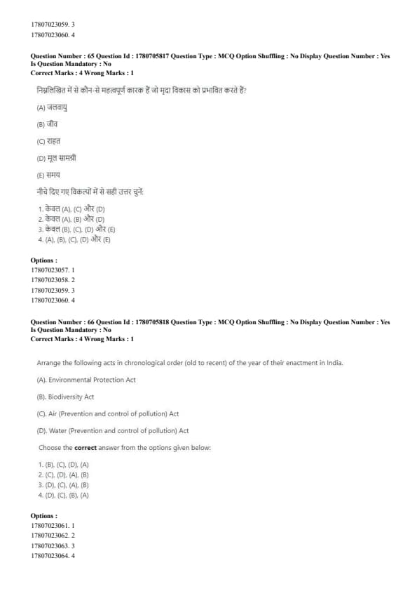Step 5: Hence, the correct chronological order (old to recent) is: \[ (D) \rightarrow (C) \rightarrow (A) \rightarrow (B) \] Quick Tip: Important environmental Acts in India (chronological): Water Act (1974) \(\rightarrow\) Air Act (1981) \(\rightarrow\) Environment Protection Act (1986) \(\rightarrow\) Biodiversity Act (2002).