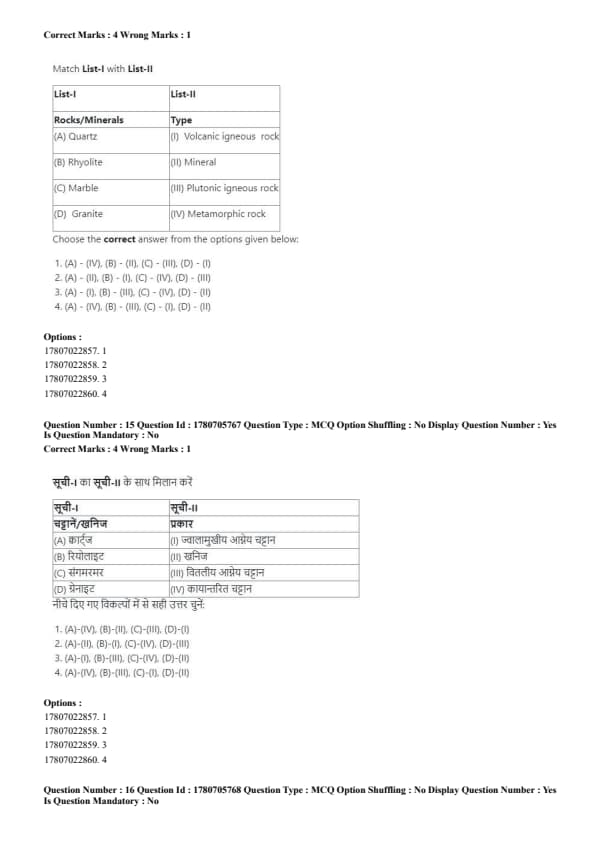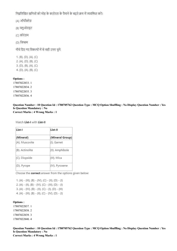 (A)–(III), (B)–(II), (C)–(IV), (D)–(I). Quick Tip: Common mineral groups: Muscovite \(\rightarrow\) Mica, Actinolite \(\rightarrow\) Amphibole, Diopside \(\rightarrow\) Pyroxene, Pyrope \(\rightarrow\) Garnet.