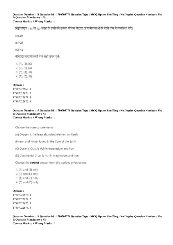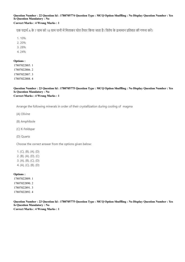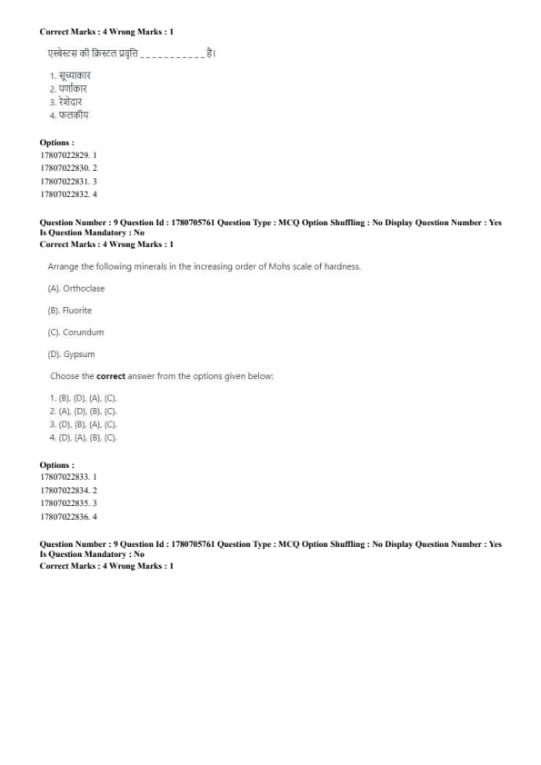 Step 4: Hence, the correct sequence is (D), (B), (A), (C). Quick Tip: Remember key Mohs values: Gypsum (2), Fluorite (4), Orthoclase (6), Corundum (9). Lower number means softer mineral.