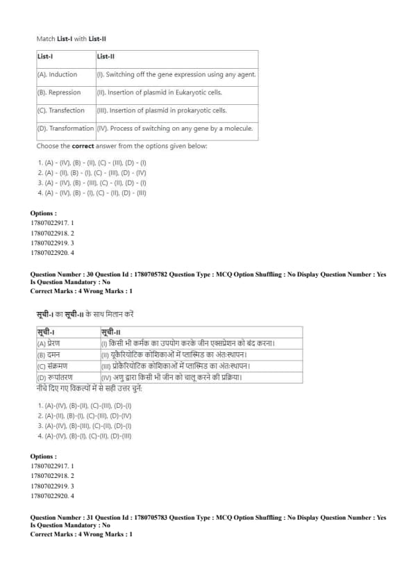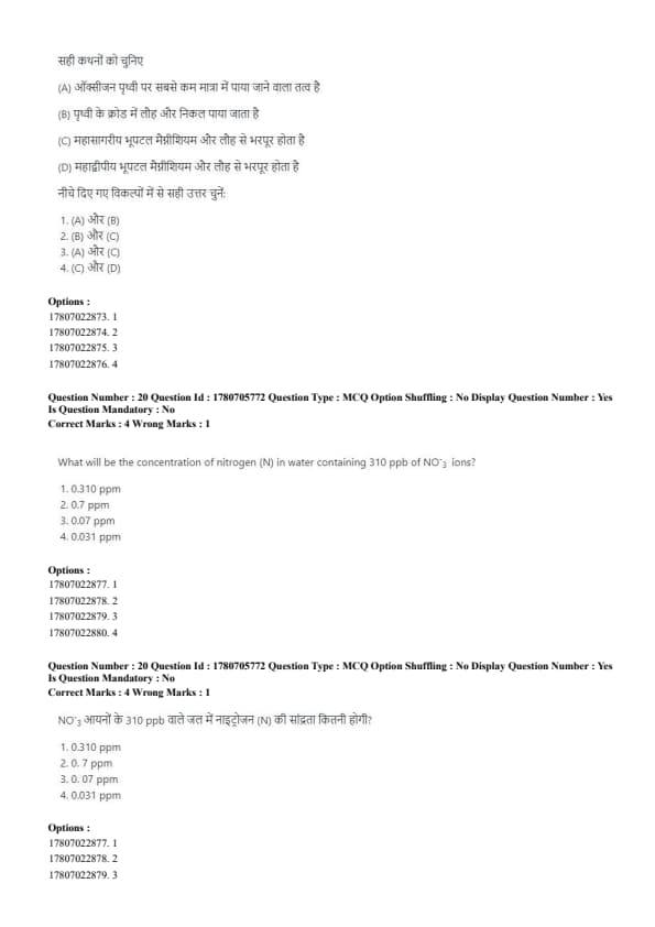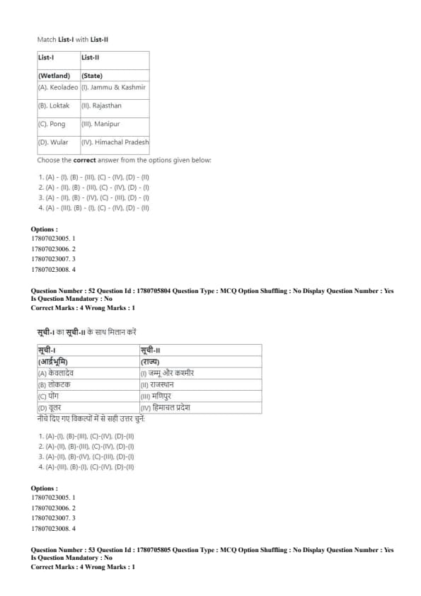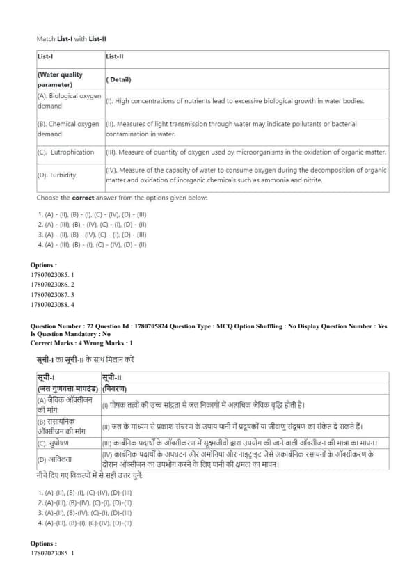 So, (D) \(\rightarrow\) (II). Quick Tip: BOD \(\rightarrow\) biological oxidation of organic matter, COD \(\rightarrow\) chemical oxidation (organic + inorganic), Eutrophication \(\rightarrow\) nutrient enrichment, Turbidity \(\rightarrow\) water clarity.
