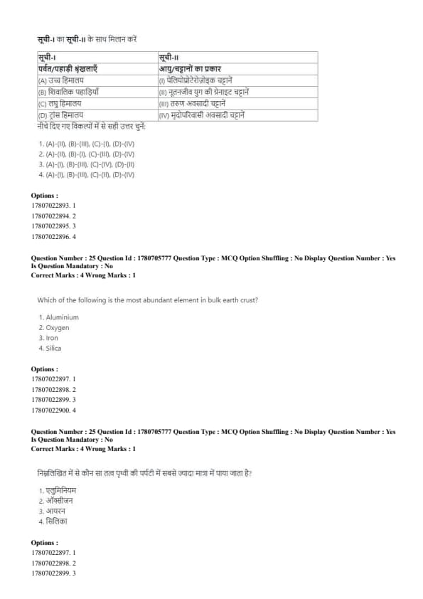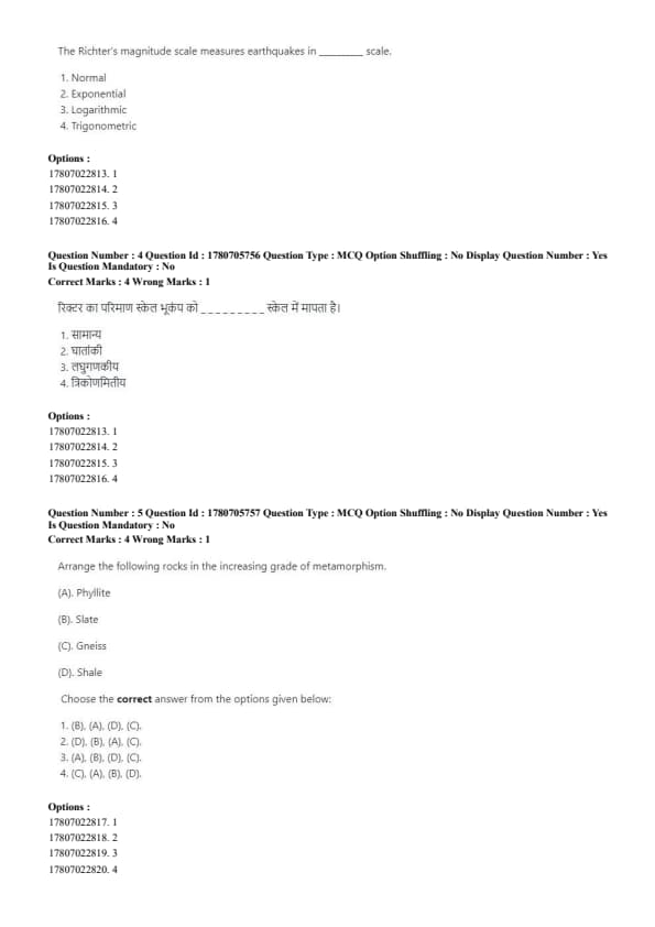 Step 5: Hence, the correct increasing order of metamorphism is: \[ Shale \rightarrow Slate \rightarrow Phyllite \rightarrow Gneiss \] Quick Tip: Increasing grade of metamorphism generally follows: Shale \(\rightarrow\) Slate \(\rightarrow\) Phyllite \(\rightarrow\) Schist \(\rightarrow\) Gneiss.