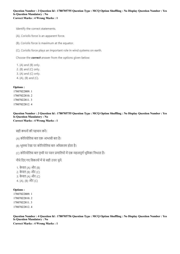 Step 4: Therefore, the correct statements are (A) and (C) only. Quick Tip: Coriolis force depends on latitude: - Zero at the equator - Maximum at the poles It strongly influences atmospheric and oceanic circulation.