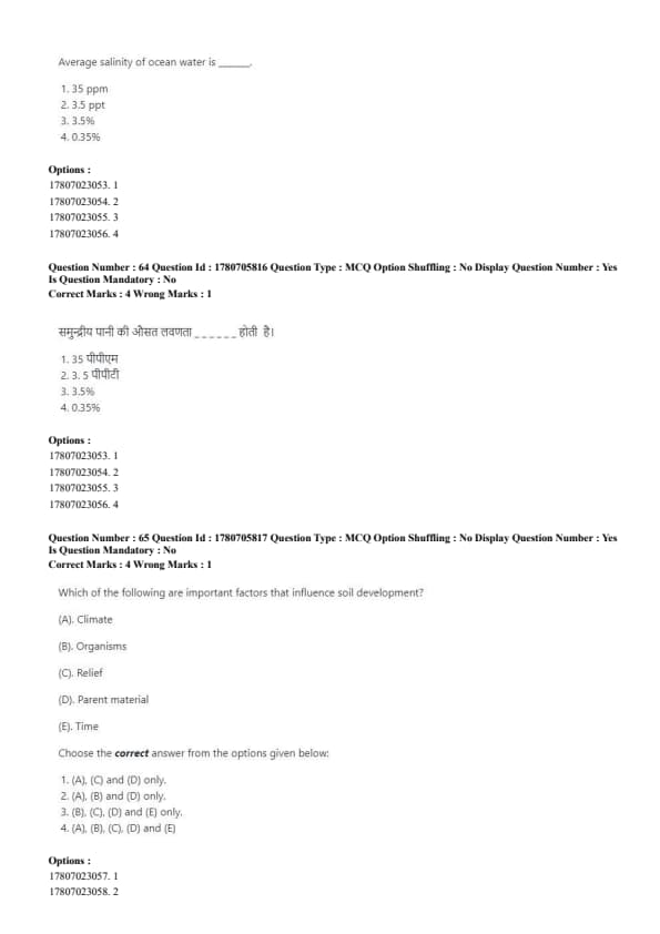 Step 7: Hence, all the given factors influence soil development. Quick Tip: Soil-forming factors = \textbf{CLORPT}: Climate, Organisms, Relief, Parent material, Time.