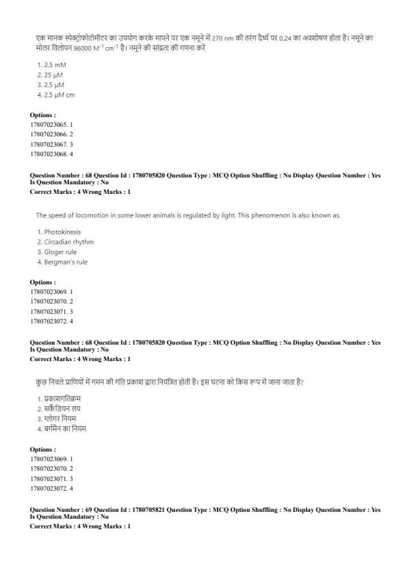 Step 4: Convert molarity to micromolar: \[ 2.5 \times 10^{-6}\,M = 2.5\,\muM \] Quick Tip: For spectrophotometry problems, remember: \[ A = \varepsilon l c \] For a standard cuvette, \(l = 1\,cm\), which simplifies calculations.